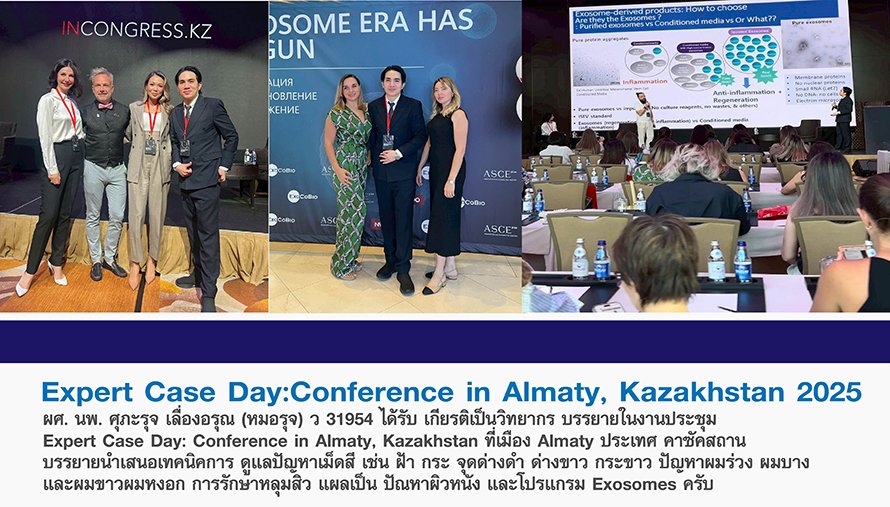 Assistant Professor Dr. Suparuj Lueangarun (Dr. Ruj) was honored to be an invited speaker at the Expert Case Day: Conference in Almaty, Kazakhstan, held in Almaty, Kazakhstan. He delivered a lecture presenting advanced techniques for the management of pigmentation disorders such as melasma, freckles, dark spots, vitiligo, and leukoderma, as well as hair-related concerns including hair loss, thinning hair, and premature greying. His presentation also covered the treatment of acne scars, skin scars, other dermatological conditions, and innovative applications of exosome-based therapy programs.