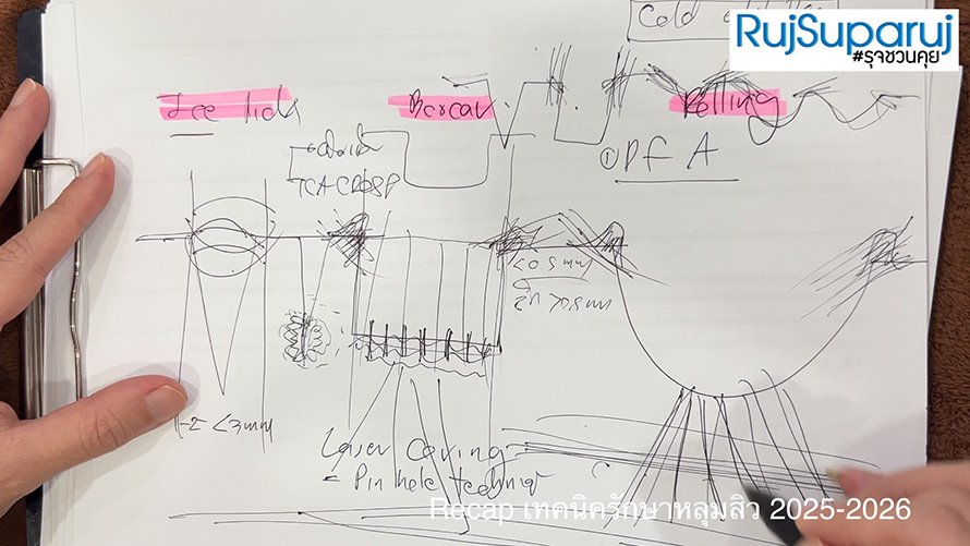 • Fractional CO2 / Erbium Laser: ยังคงมีบทบาทสำคัญ โดยเฉพาะเทคนิค Laser Ablative เพื่อเกลี่ยขอบหลุมให้เรียบ (Edge Leveling) หรือการใช้เทคนิค Pinhole / Laser Coring เพื่อลดขนาดหลุมที่กว้าง [12:46]