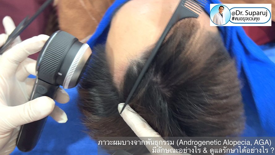 • การตรวจด้วยกล้องขยาย (Trichoscopy): จะพบว่าเส้นผมมีขนาดเล็กลงมาก (Miniaturization) จนมีลักษณะคล้ายเส้นด้าย หากตรวจพบเส้นผมที่มีขนาดเล็กเกิน 20% ในบริเวณที่กังวล จะได้รับการวินิจฉัยว่าเป็นภาวะผมบางจากพันธุกรรม